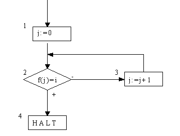 Þ: Falls A leer ist, leistet die Funktion g mit g(i)= div für alle i das gewünschte. Falls A nicht leer ist, gibt es eine berechenbare Funktion f mit f(IN)=A. Def dann g durch g(i):=das kleinste j mit f(j)=i. Diese Funktion ist berechenbar, denn sie entspricht folgendem FD: